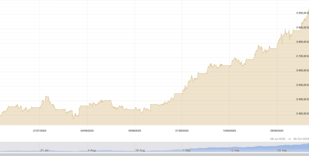 Na današnji dan je cena zlata prebila tehnično pomembno mejo 4.000 ameriških dolarjev za unčo. Ta mejnik ni le najvišja dosedanja cena zlata v zgodovini, temveč pomemben signal globljih sprememb v načinu odzivanja vlagateljev, strategijah upravljanja kapitala in zaznavanju sistemskih tveganj.