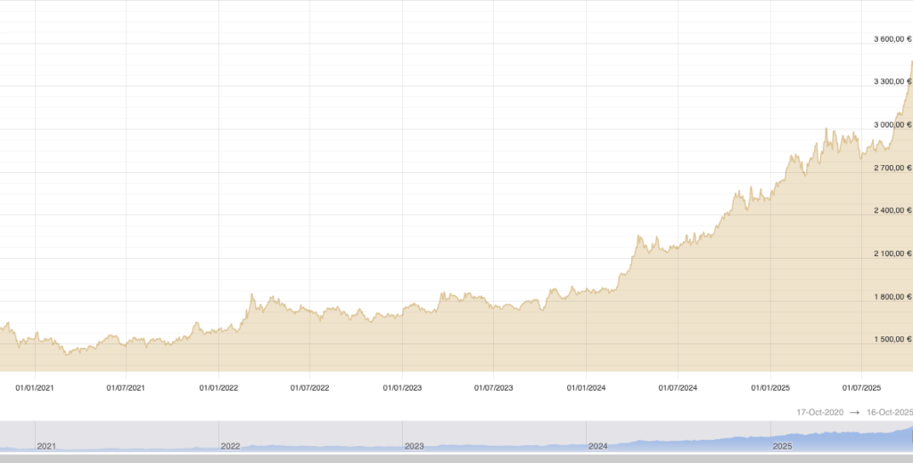 Oktobra 2020 je cena zlata znašala približno 1.600 EUR za unčo. Do oktobra 2025, v obdobju petih let, je narasla na približno 3.600 USD (+123 %). Če bi vlagatelj leta 2020 kupil 100 gramov zlata (približno 3,2 unče), bi: