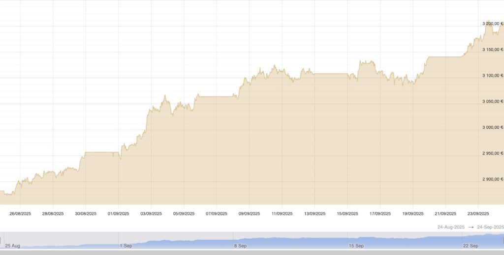 Gold continues to affirm its role as one of the strongest safe-haven assets during times of market turbulence. Over the past week, its market price has risen by more than 11 percent to €3,204.09 per ounce, just shy of the all-time high of €3,208.02 per ounce. This rally is driven by mounting geopolitical uncertainty, expectations of U.S. interest-rate cuts, and growing demand from both private and institutional investors seeking securityfactors that together sustain the precious metal’s appeal and keep prices close to record levels.